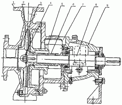 1、泵体2、叶轮3、密封环4、叶轮螺母5、泵盖6、密封部件7、中间支架8、轴9、悬架部件